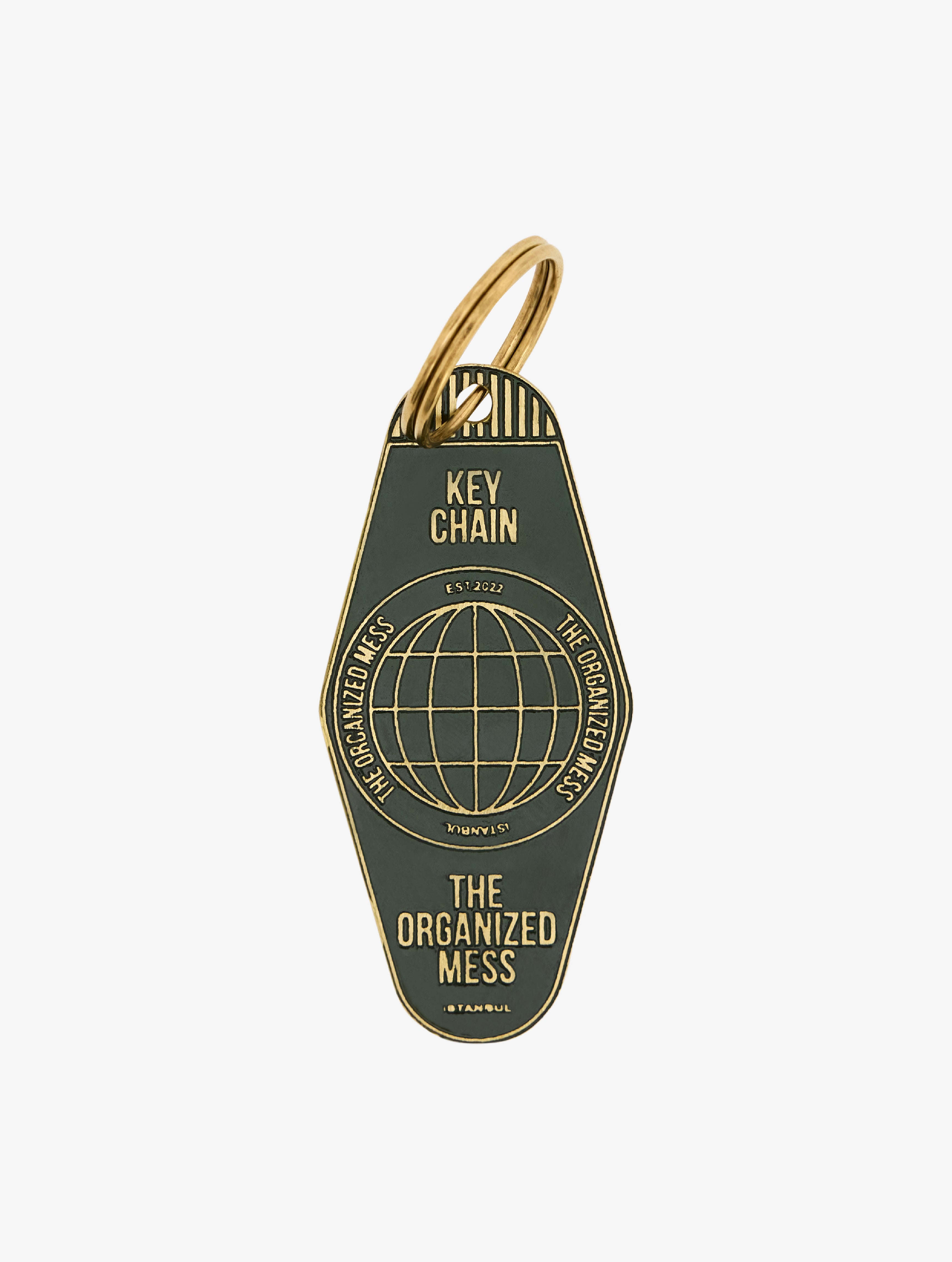 Antique-effect enamel keychain with brass logo and contour details.