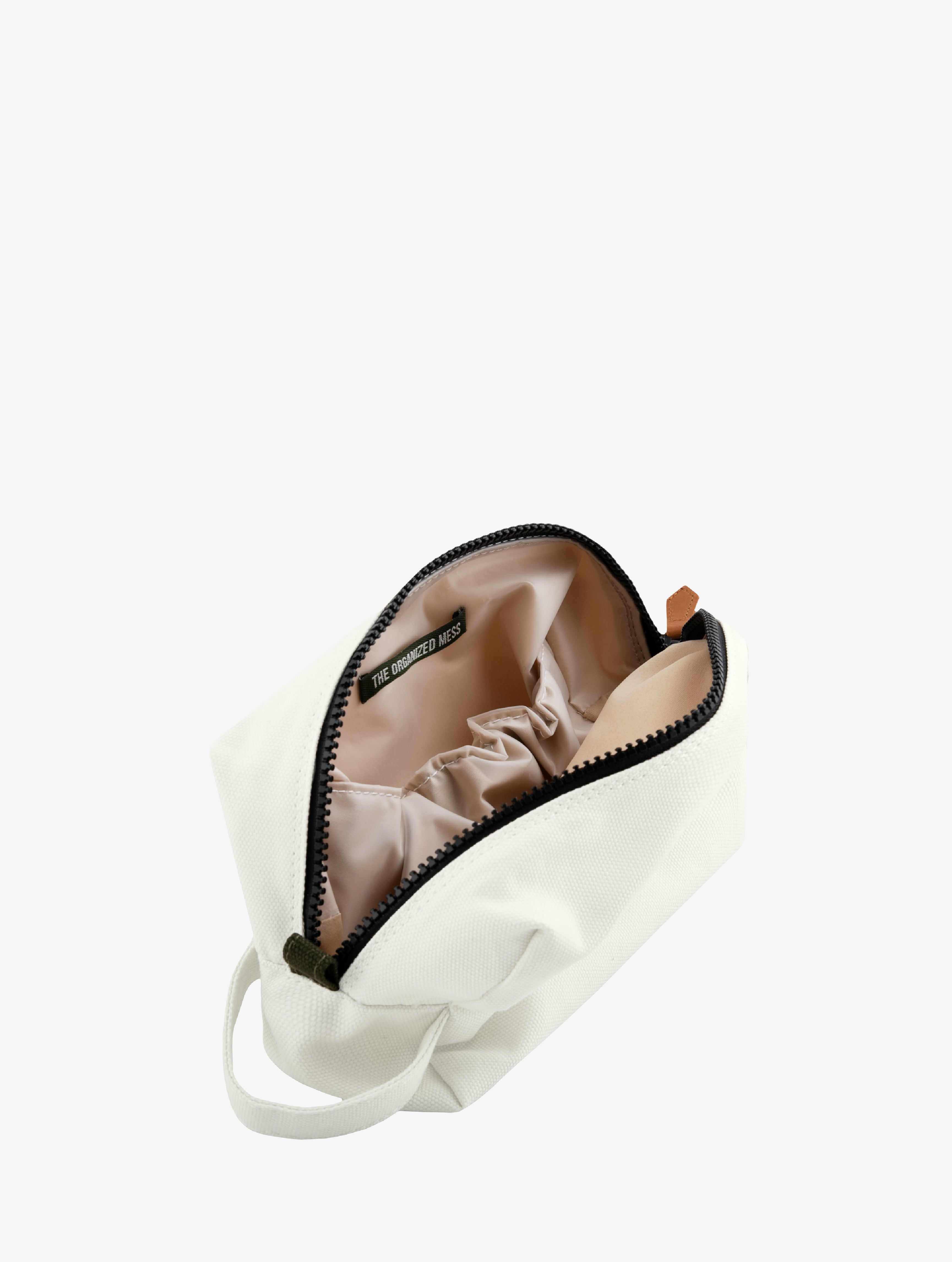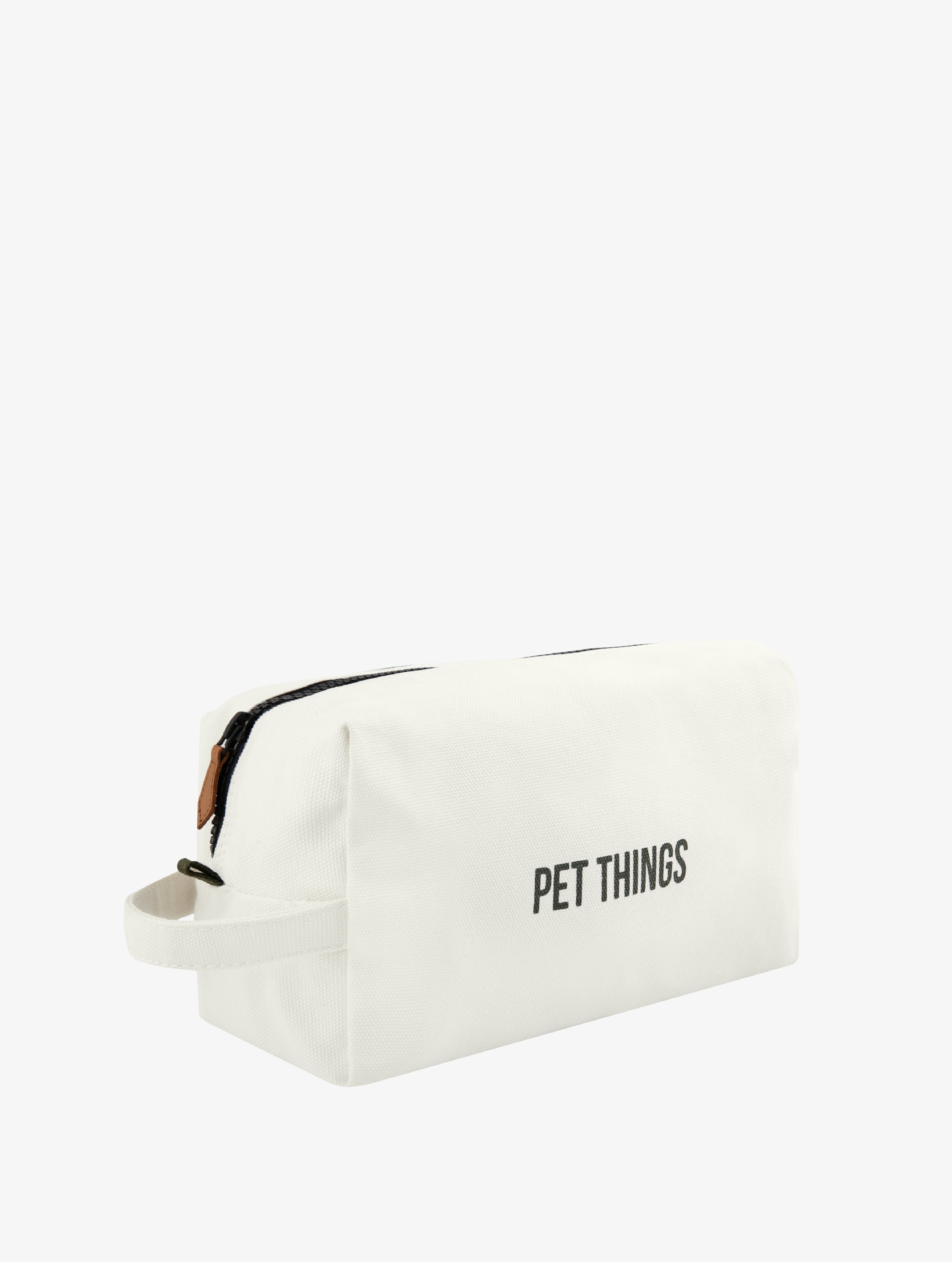Zippered canvas pet accessory bag with printed lettering detail. Waterproof, transparent inner pocket makes storing liquids easy. Removable brown leather handle minimizes wear and tear during washing.