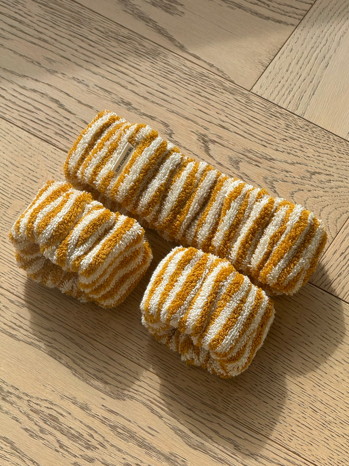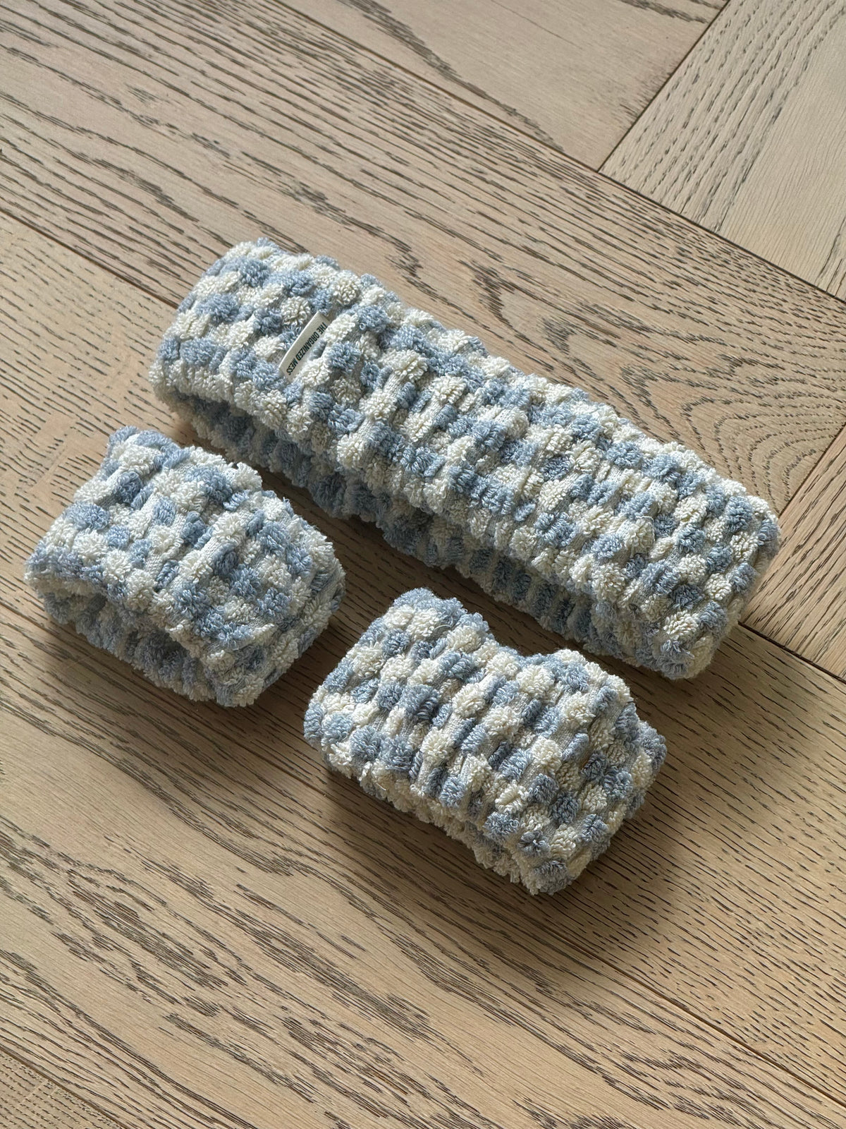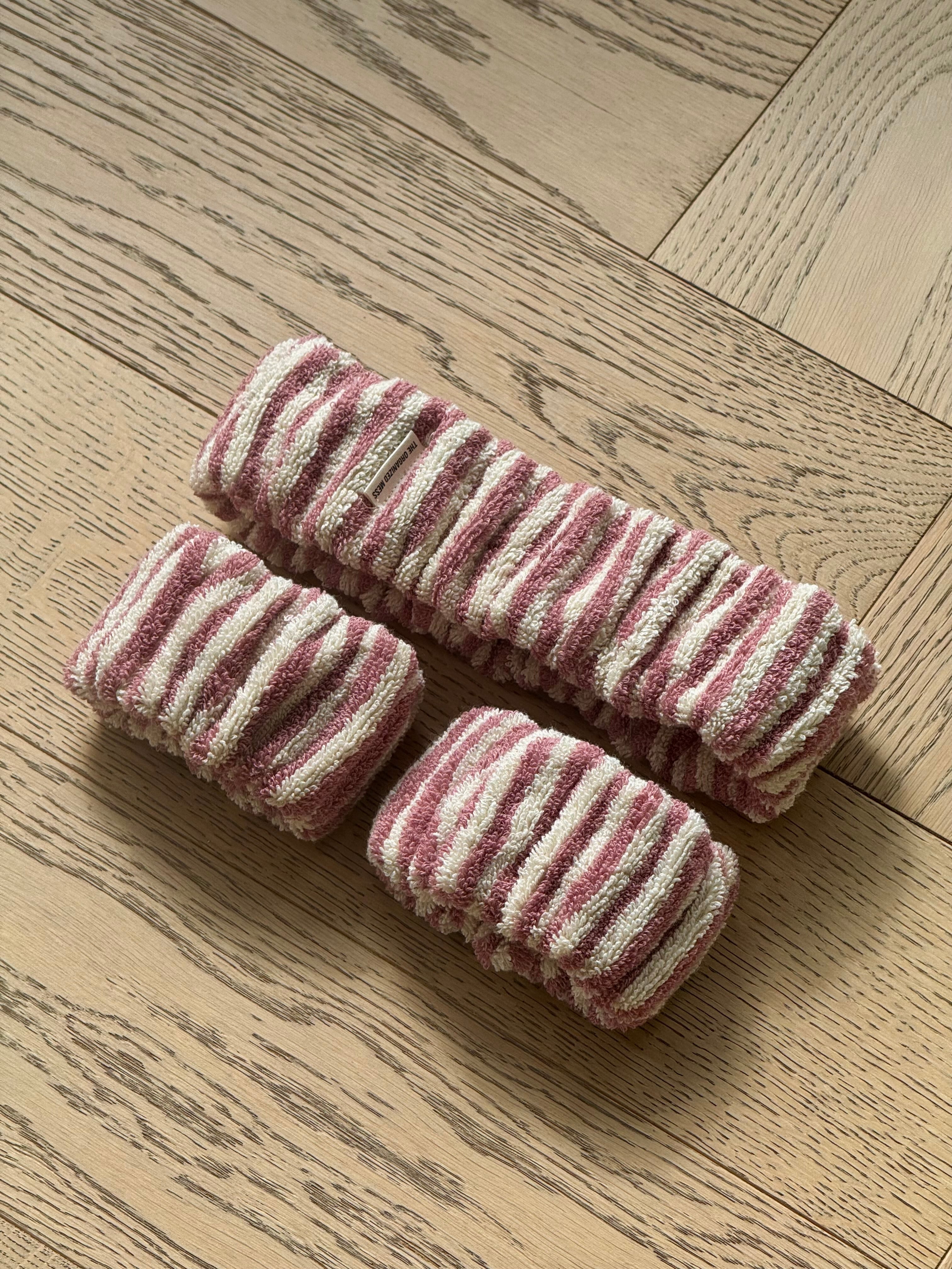 A 100% cotton terry set consisting of a headband and two wristbands . Clean, simple, and made to keep you dry while getting ready, in style. One size fits all.