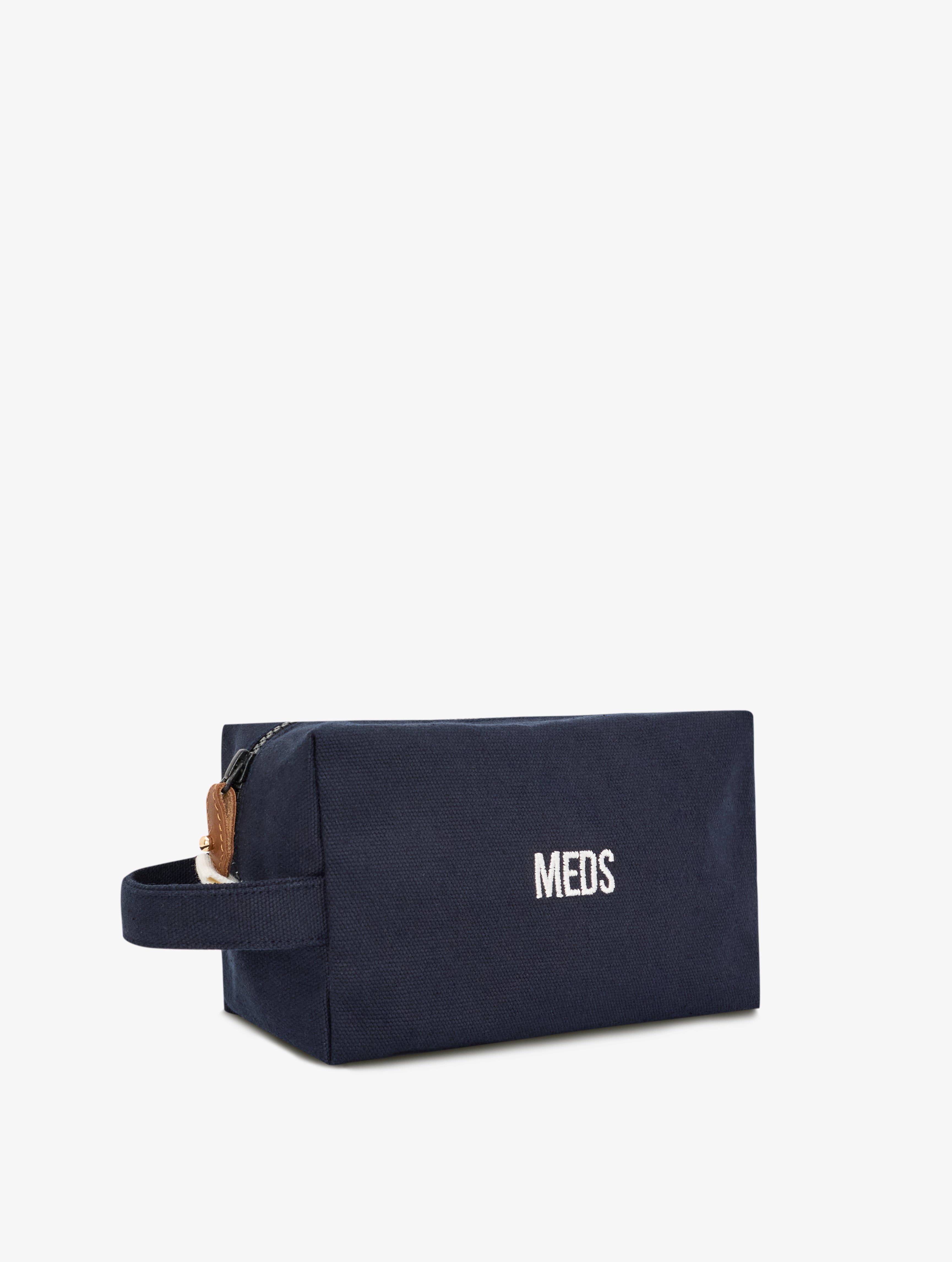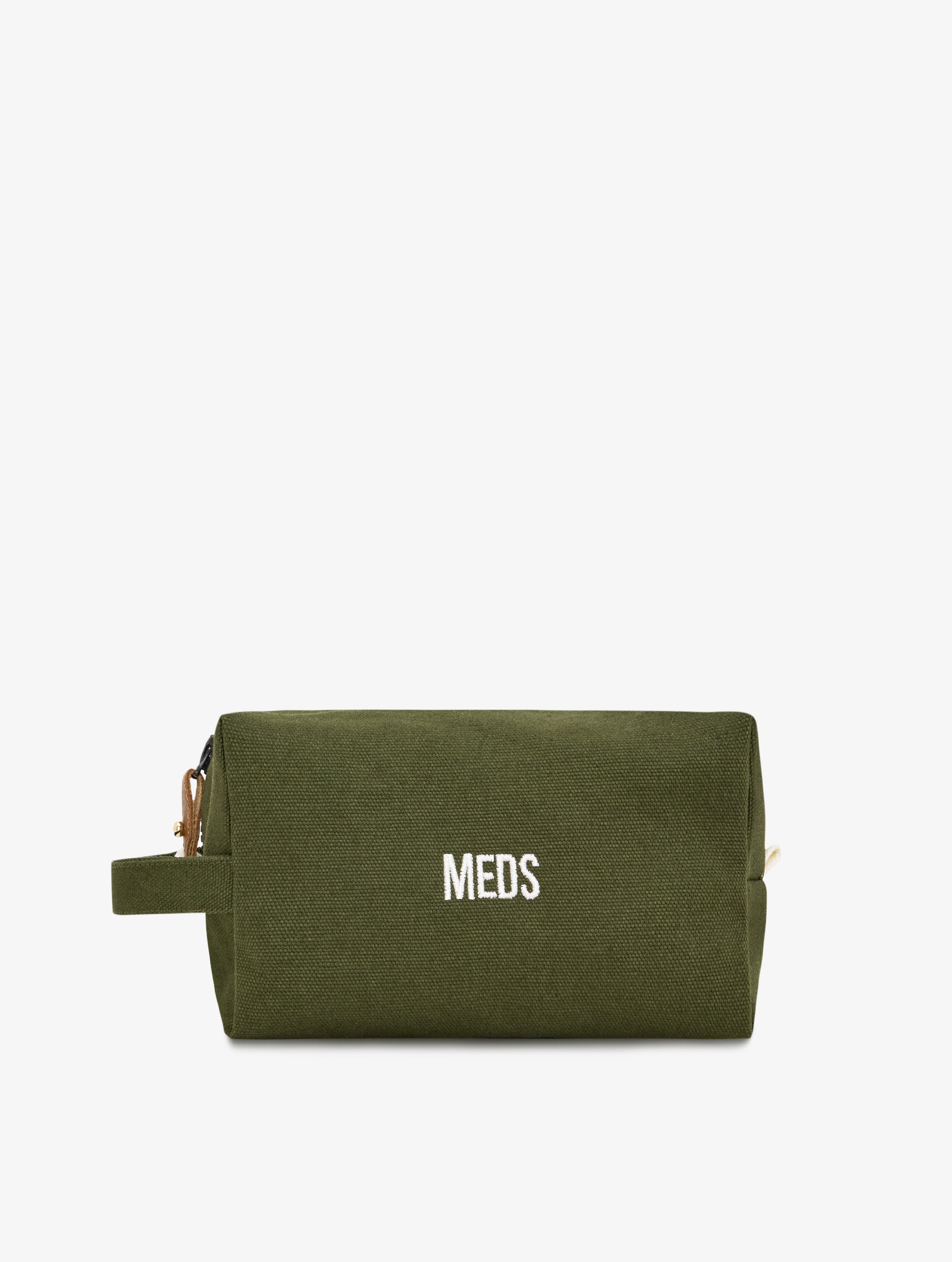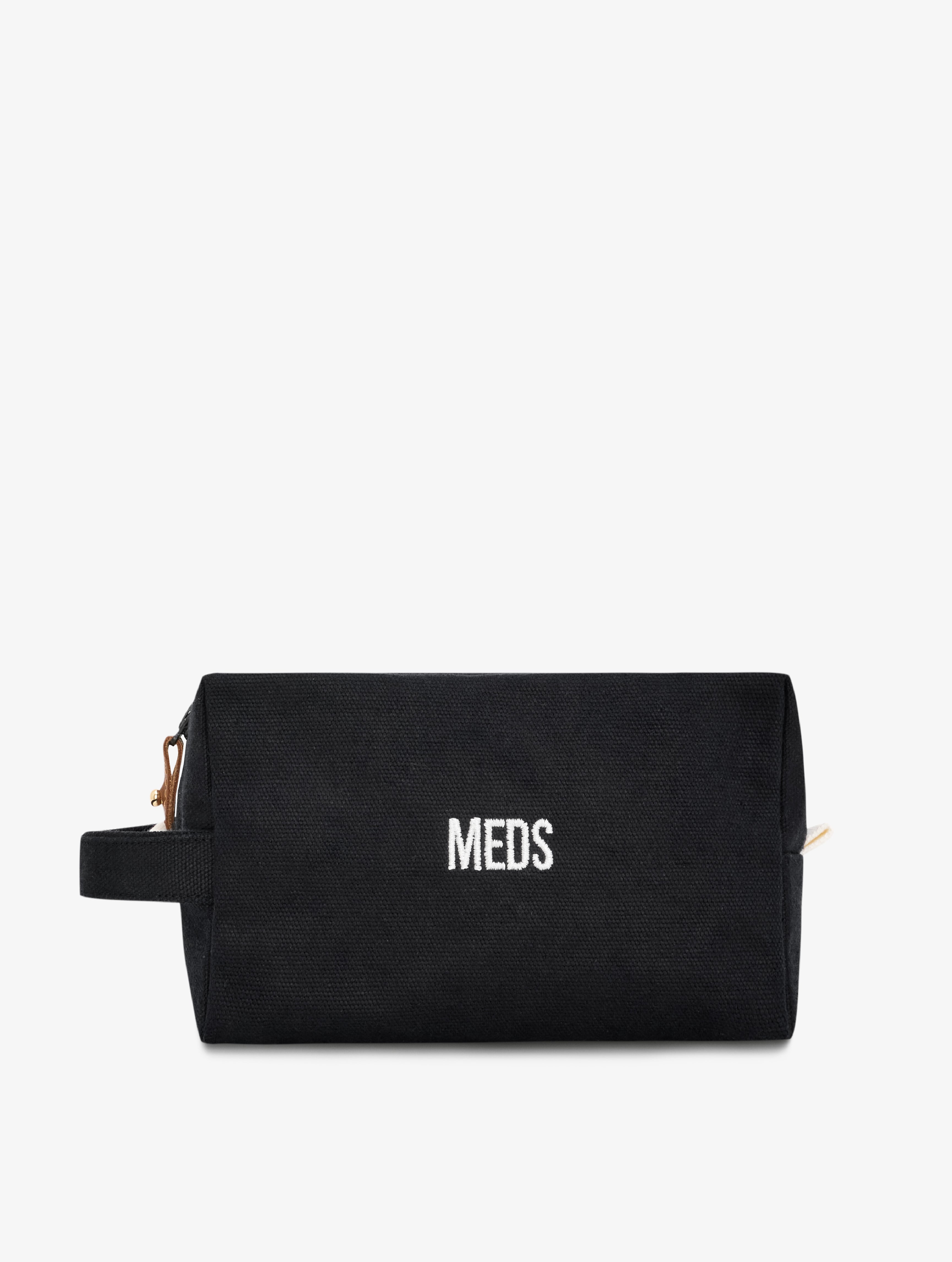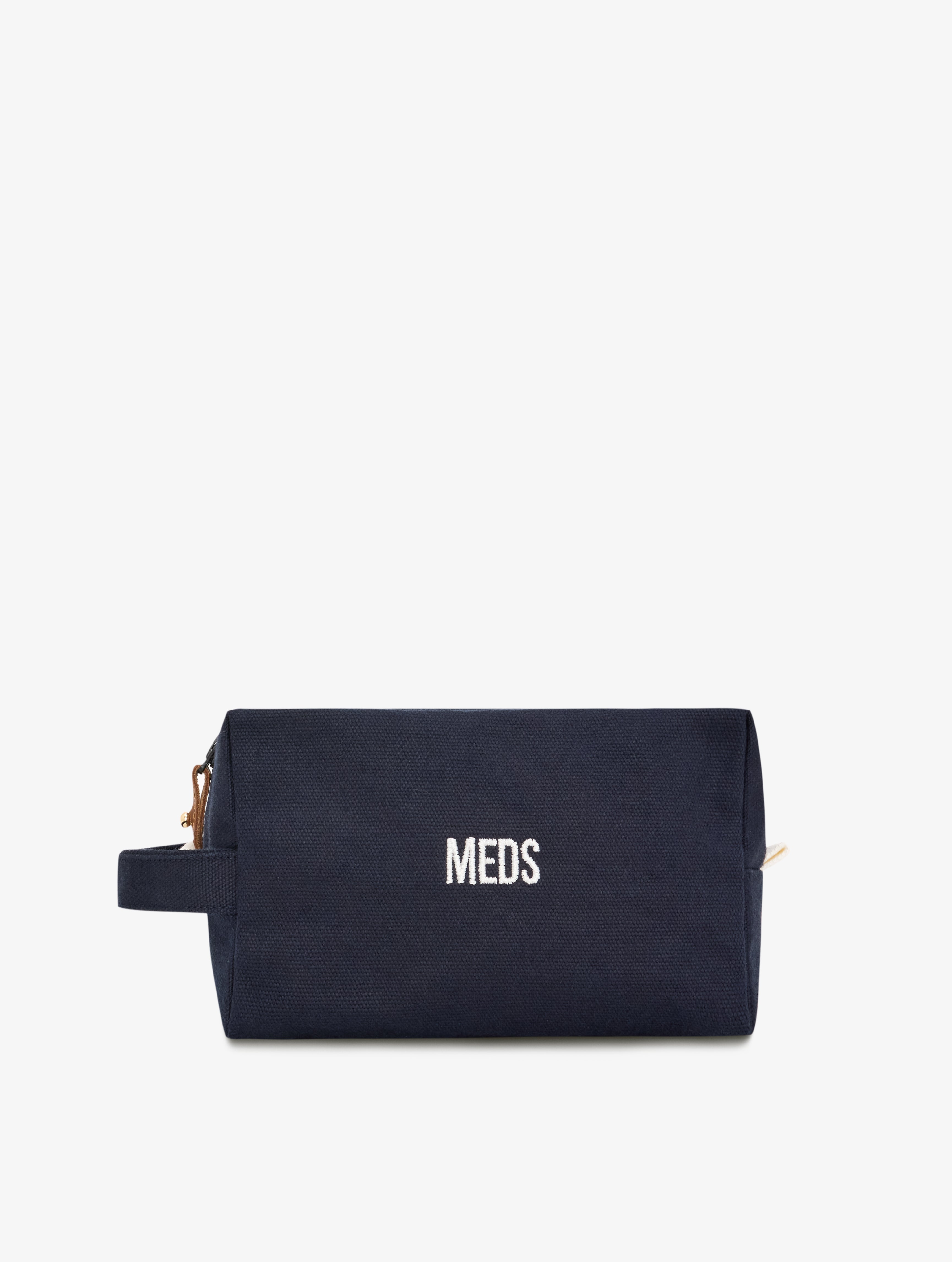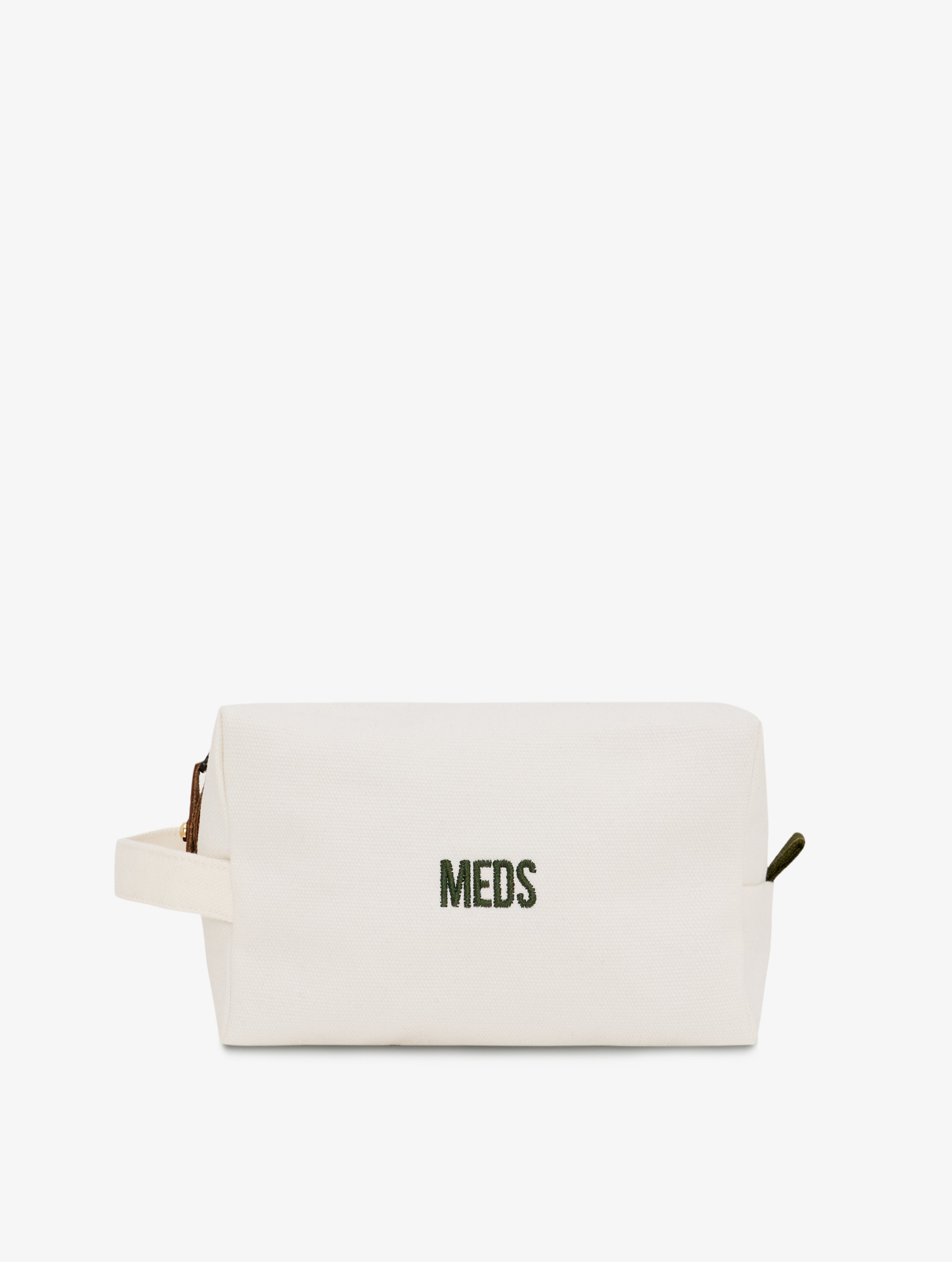Nakış yazı detaylı, fermuarlı kanvas ilaç çantası. Su geçirmez saydam iç cebi sayesinde likit ürünlerin saklanmasını kolaylaştırır. Çıkarılabilen kahverengi deri elcik, yıkamalarda aşınmayı minimuma indirir.