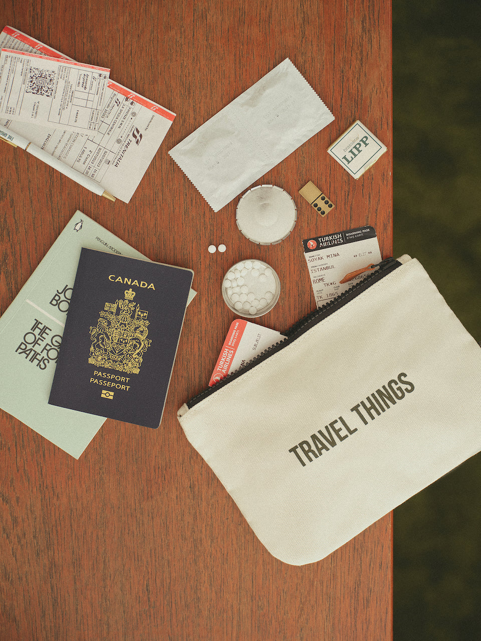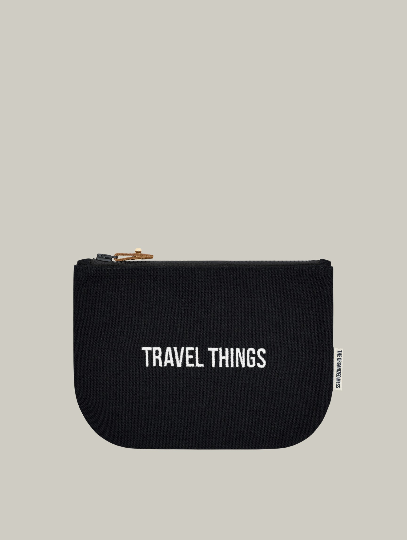 A canvas pouch with a black zipper and brown leather puller, with “TRAVEL THINGS” embroidered in bold letters across the front, and a sand colored fabric liner in the interior.