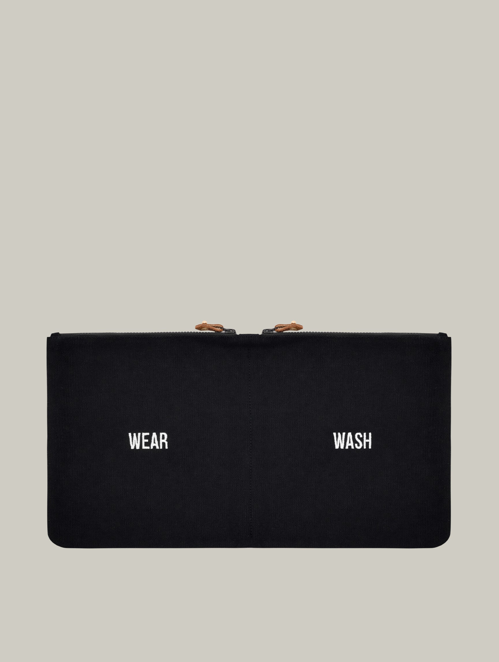 A canvas pouch with two compartments that have black zippers and brown leather pullers, with ‘WEAR” and "WASH" embroidered across the front, and a sand colored fabric liner in the interior. *Please note that ecru and green colored bags will be delivered with printed wording.
